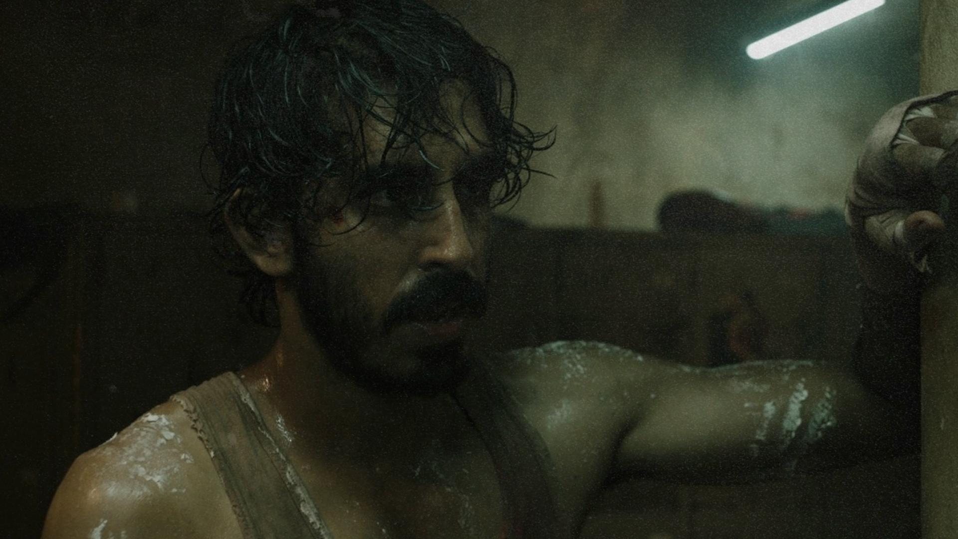 Volvemos un plano medio de Ale. Lo vemos recostado, sudado, en una posición incómoda. Mira hacia ningún lugar. Hay agotamiento emocional, sin filtro.