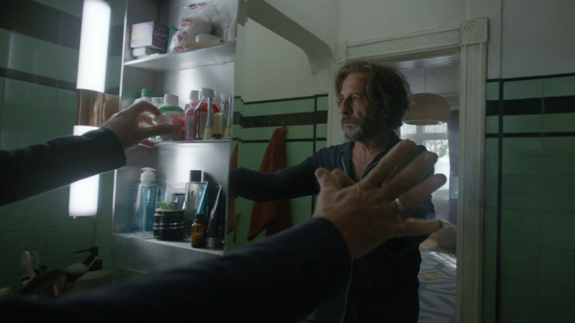 Cortamos a Ale, ahora frente al espejo del baño. Vemos sus manos acercarse al reflejo, como si necesitara comprobar que está ahí. El espejo devuelve otra versión de sí mismo. Es el mismísimo Kurz a quien vemos cantando. Empieza a aparecer la idea de la otra mitad.