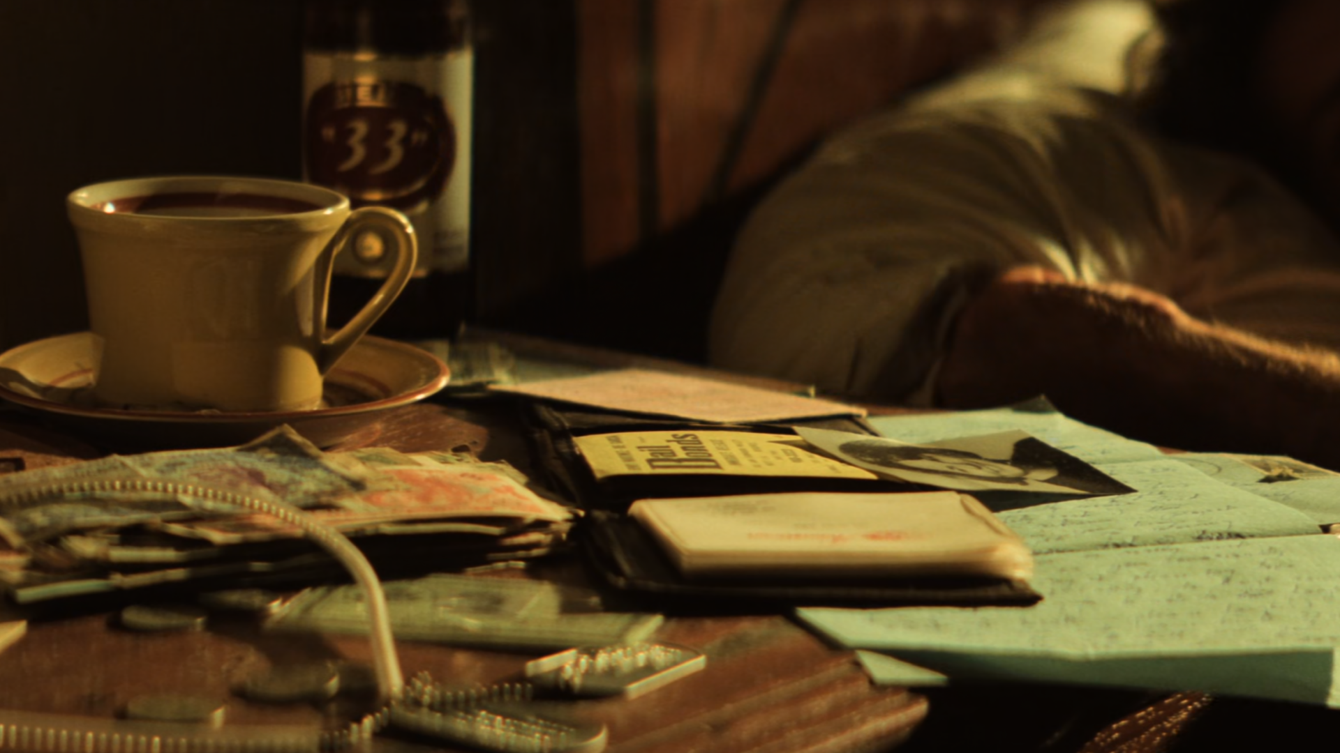 Cortamos a una mesita desordenada con diferentes objetos: Papeles, un libro, fotos, etc. Nada parece reciente. El pasado sigue ocupando espacio. Junto a todos estos elementos hay una jarra de agua. Ale la agarra y empieza a servirse agua en un vaso.